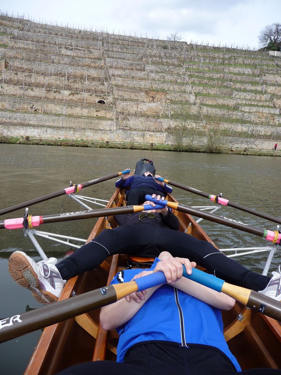 Die Jugend war über Ostern im Trainingslager in Marbach am Neckar. Da der Neckar ein schönes Rudergewässer sein soll, entschlossen wir uns kurzerhand mitzufahren und dort eine 2-Tagestour zu machen. Eine Wanderfahrt im April ist wettertechnisch schon etwas risikobehaftet und so sahen die Wettervorhersagen lange nicht rosig aus. Von Regen bis Schneeschauer war alles drin. Aber einen Tag vorher wendete sich das Blatt und wir hatten einen Sonne-Wolken- Mix bei idealen Rudertemperaturen. Wir starteten freitags in Marbach und ruderten flussabwärts über 3 Schleusen nach Lauffen. Dank der moderaten Etappenlänge von 31 km erreichten wir unser Ziel schon am späten Nachmittag und konnten so das schöne Städtchen Lauffen noch bei strahlendem Sonnenschein besichtigen. Da das Bootshaus in Lauffen belegt war und um Gepäck zu sparen, übernachteten wir dort in einer einfachen Pension. Am nächsten Tag ruderten wir dann wieder zurück nach Marbach. Auch die Rückrichtung war aufgrund der geringen Strömung schnell geschafft und wir konnten gegen 14 Uhr noch kurz vor dem einsetzenden Regenschauer unser Boot in Marbach abriggern. Vielen Dank auch nochmal an Steffen für den Bootstransport. Stefan Weisenberger