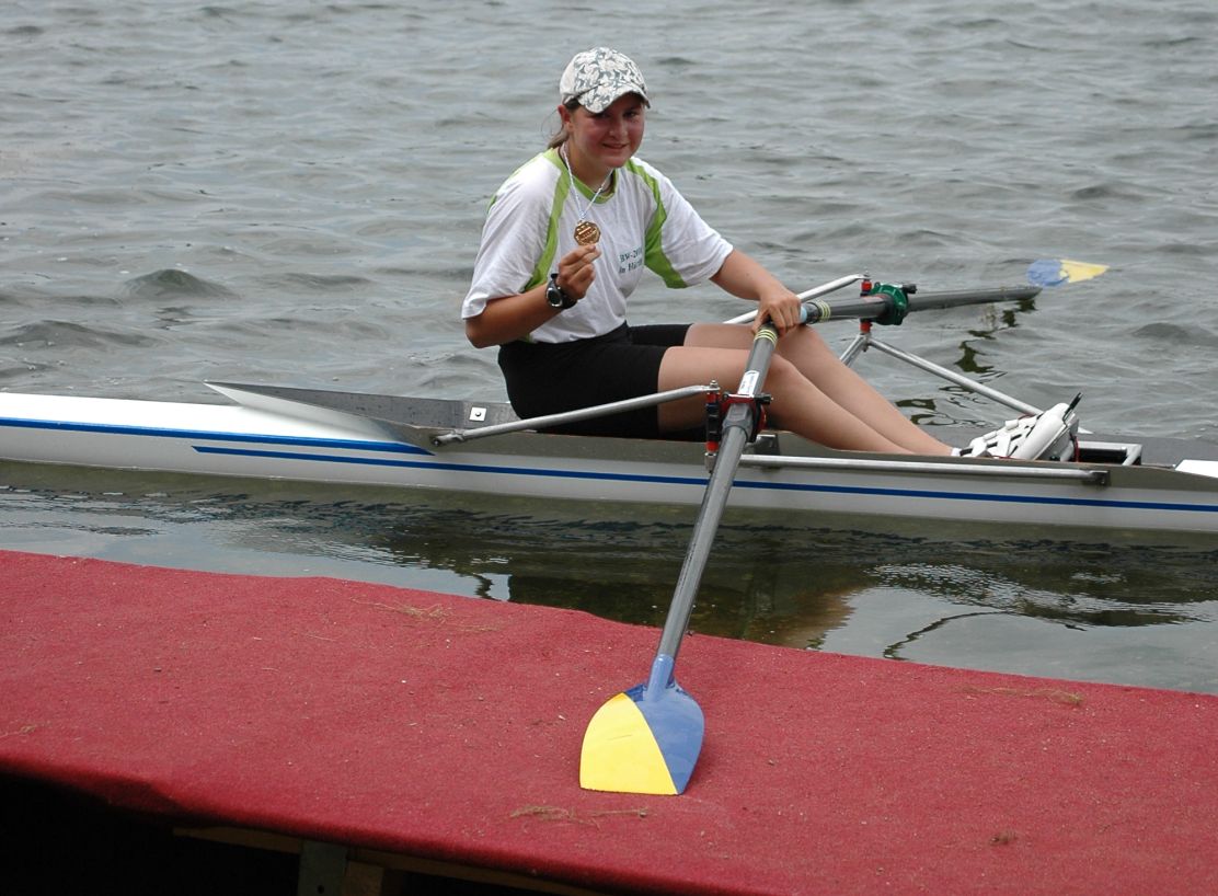 Bundeswettbewerb 2010 in Hürth Der Alemanne Jasper Neemann hatte sich bei den Vorqualifikationen als bester Einerfahrer in der Klasse der 14-jährigen aus Baden-Württemberg für das Bundesfinale in Hürth qualifiziert. Nach dem der Bus und der Bootswagen relativ spät ankam, gab es für Jasper vorort leider keine Möglichkeit mehr sich mit dem Otto-Maigler-See vertraut zu machen. Er musste das Langstreckenrennen (3.000 m) antreten, ohne sich groß vorbereiten zu können. Der 13. Platz ist da eigentlich ein gutes Ergebnis, auch wenn die letzten 1.000m ihm sichtlich schwer fielen und hier noch einiges an Potential bieten. Beim anschließenden 1.000 m Rennen fuhr Jasper demzufolge im C-Finale und fuhr die ersten 500 m ein recht ordentliches Rennen. Er lag klar an zweiter Stelle. Auf dem 2. Teil der Strecke war dann deutlich zu erkennen, daß er noch etwas Rudererfahrung sammeln muss: Während die anderen einen wirklich fulminanten Endspurt hinlegten konnte Jasper nicht dagegen halten und wurde dann schlussendlich Vierter. Lea Jeschke die Tochter von Heinz Moos startet für den Akademischen Ruderverein Leipzig. Bei der Langstrecke in der Altersklasse der 14-jährigen wurde sie Achte. Damit war Sie nicht zufrieden. Beim anschließenden 1.000 m Rennen fuhr sie im B-Finale und gewann dies. Wir werden wohl beide bei der Herbstregatta in Karlsruhe als Starter für die Alemannia sehen. Heinz Moos