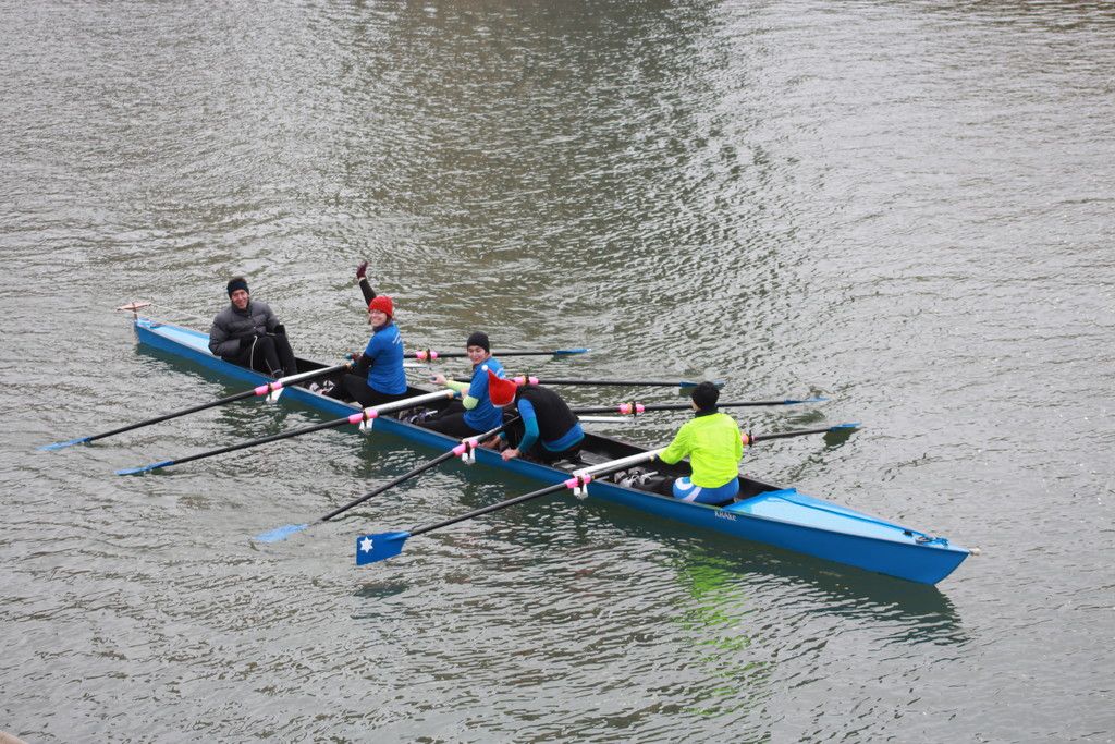 Souverän fuhren Rita, Gloria, SebastianF, MatthiasA und Steuerfrau Melanie den Mix-Vierer in der jüngsten Altersklasse nach Hause. Dieser Wettstreit lieferte auch den Pokalgewinner der B-Note: Der Nikolaus vom Weisenauer Ruderverein steuerte nicht nur seinen vierspännigen C-Gig-Wasserschlitten mit dem rotnasigen Rudolph im Bug, sondern auch den „Kostümwettbewerb“ unangefochten nach Hause. Ein echter Augenschmaus auf der winterlichen Wachsbleiche!