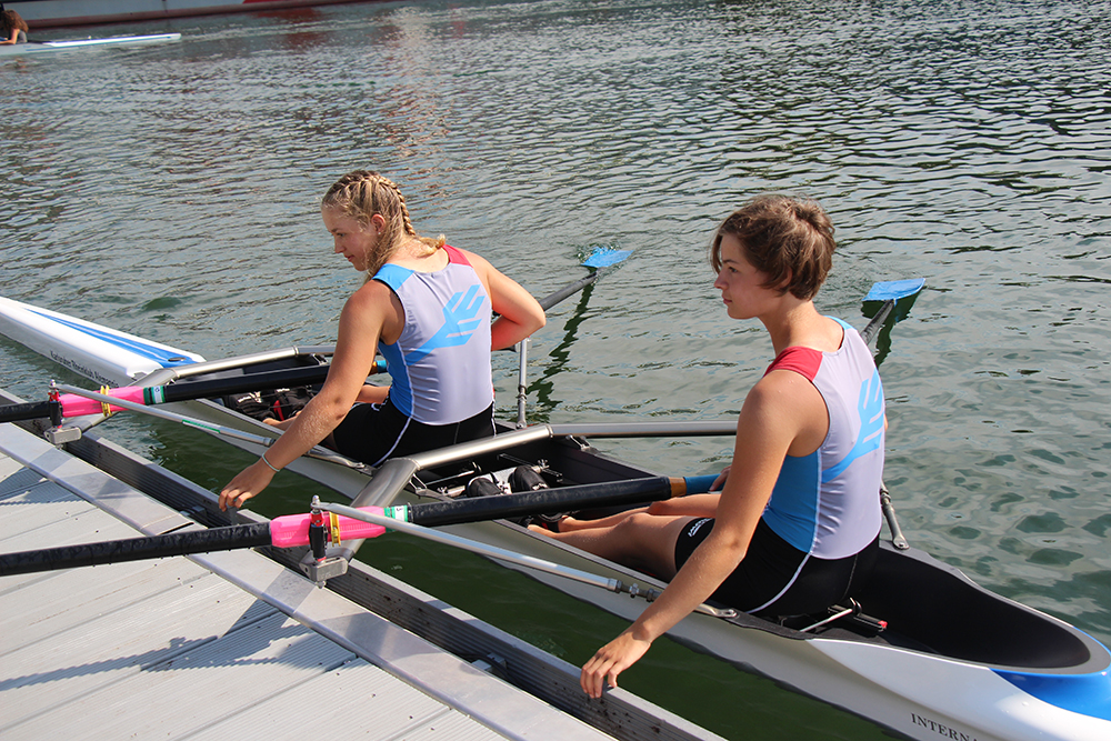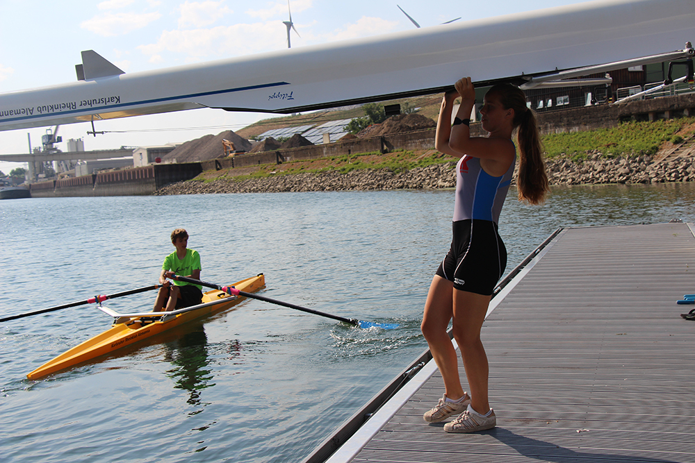 „Es ist schön, dass dieses Jahr so viele Jugendliche hier sind“, bemerkten einige Alemannen auf ihrer schattigen Bank. Jugendliche Ruderinnen und Ruderer standen wohlgeordnet in Reih und Glied mit leuchtend blauen Skulls an der Rennboothalle. Auf dem Bootsplatz waren 5 Boote aufgeriggert gelagert. Josef erläuterte was es mit den noch teils abgedeckten Booten auf sich hat. 3 Skiffboote, „Orion“, „Regine“ und „Banane“ sowie „KRAftzwerg“, ein Renn-Doppelzweier und „KRAftwerk“, ein Renn-Doppelvierer sind Neuanschaffungen für die Jugendlichen. Sie übergossen die Boote mit Sekt aus einem Silbernen Pokal und wünschten ihnen „allzeit gute Fahrt und stets eine Handbreit Wasser unter dem Kiel“. Nun konnten die Boote zum Steg getragen und zu Wasser gelassen werden. Alle Boote waren fahrtauglich und am Bootssteg drängten sich bald viele Neugierige, um auch einmal das Rudern auszuprobieren. Sogar die kleine Lotte durfte mit Schwimmweste im Ruderboot als kleines „Kielschweinchen“ mitfahren. Lotte war so sehr begeistert und wollte ein zweites Mal mit. In ein paar Jahren wird sie wohl selbst einmal Rudersportlerin werden.