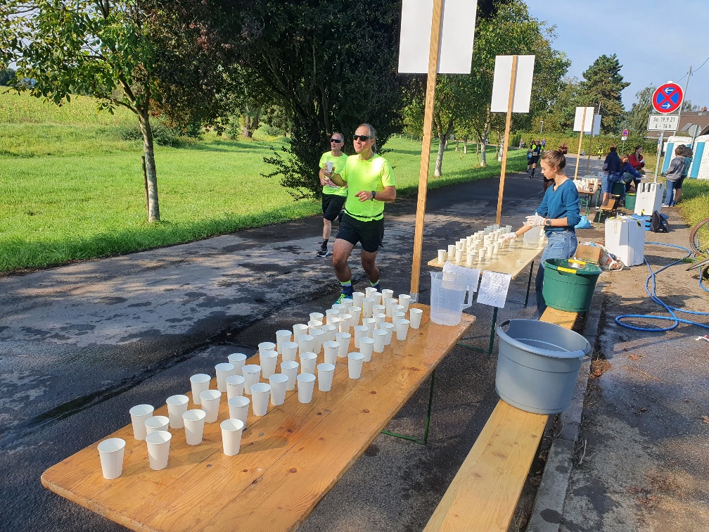 In diesem Jahr wieder deutlich größer und näher an alter Normalität: Der Karlsruher Marathon fand dieses Jahr über die halbe Distanz statt, in mehreren Wellen gingen jeweils bis zu 2000 Läufer pro Welle auf die Laufstrecke. Bei Streckenhälfte sorgten die Jugendlichen der Alemannia für Erfrischung der Läufer mit Iso und Wasser.