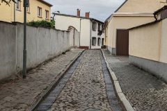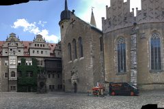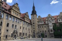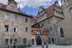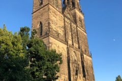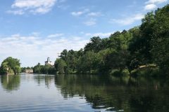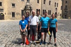 Kaum ist das Frühstück eingenommen, kommt der kleine Hunger. Dumm ist das nur, wenn sich der Reiseproviant im anderen Boot befindet. Für uns jedoch kein Problem, die gekochten Eier werden einfach rübergeworfen. Ein kurzer Stopp in Merseburg: Der Dom wird einmal umrundet und wir gönnen uns wieder ein Kuchengedeck. In Halle angekommen erwartet uns eine Ferienwohnung des HRV Böllberg / Nelson. Aufteilung der Zimmer nach Zelten. Es ist ungewohnt wieder in geschlossenen Räumen zu sein. Nachdem alles ausgepackt und Jede*r geduscht hat, fahren wir mit der Straßenbahn in die Innenstadt und finden einen schönen Biergartenhof. Lange können wir jedoch nicht verweilen, nach dem Essen schlägt die Müdigkeit zu.