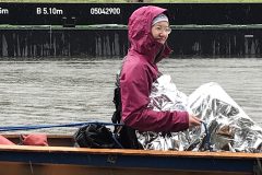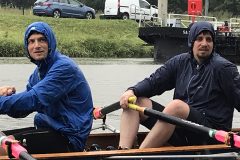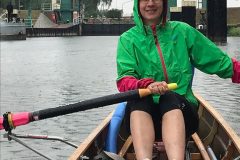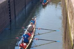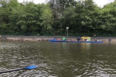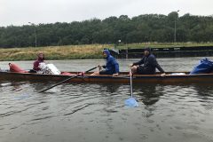 Donnerstag: Regen! Den ganzen Tag ist Regen angesagt. Der Augenblick des Setzens auf den Rudersitz mit schnell durchdringender Nässe ist jetzt nicht so prickelnd. Wir rudern mit nassen Popos und teilweise stärkerem Regen gen Calbe. Glücklicherweise hat Wolfgang wieder gezaubert: Er hat zwei Notfalldecken dabei, die die Steuernden warm halten. Die widrigen Umstände können unserer guten Stimmung aber so gar nichts an haben. Auf der Etappe bekommen wir die Nachricht, dass die Schleuse in Bernburg temporär außer Betrieb ist. Ein Weiterkommen ist fraglich…. Nach einer Mittagspause, regengeschützt und zusammengerottet unter einem Vordach, kann Johannes grünes Licht geben: Die Schleuse ist wieder in Betrieb. Der Wind frischt auf und die letzten Kilometer bis nach Calbe sind hart, noch härter. In Calbe erwartet uns beim TSG Kanu Calbe/Saale e.V. ein großes, uns verschlossenes Bootshaus. Trotz höflicher, zurückhaltender aber eindringlichen Aufforderungen seitens unseres Verantwortlichen Leiters wurde uns eine Übernachtung im Bootshaus verwehrt. Das ist schon etwas bitter, feucht und abgekämpft wie wir sind. Am Abend kurzer Gang ins Städtchen um den Kalorienhaushalt wieder aufzufüllen. 47 Kilometer, drei Schleusen.