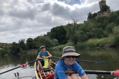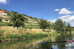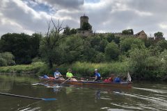 Auch heute genießen wir bombiges Wetter. Genussvolles Rudern, im Hintergrund passieren wir Schönburg und kommen an der Schleuse in Oeblitz an. Wir wissen die Schleuse ist außer Betrieb und setzen daher die Boote um. Trotz Hitze und Schlepperei ist unsere Stimmung bestens. Nach dem Einsetzen werden noch die Reste der gestrigen Pizza verspeist und weiter geht es nach Weißenfels. Hier legen wir an, der Kaffeedurst und Kuchenhunger manch Mit-Ruderin bzw. Mit-Ruderer treibt uns auf den Marktplatz und bringt uns in den Genuss leckerer Stärkung. Nach kurzem Einkauf diverser Lebensmittel gleiten wir weiter nach Bad Dürrenberg. Hier empfängt uns der nette Hauswart des Kanu Club Bad Dürrenberg e.V. Die Warmwasserversorgung wird durch sein Anschüren der Holzheizung garantiert. In einer Garage des Bootshaus befindet sich eine Gästeküche und wir bereiten uns gemeinsam ein leckeres Abendessen vor. Ein kühles Radler mundet uns allen und gegenüber können wir in der Abendsonne das Gradierwerk bewundern.