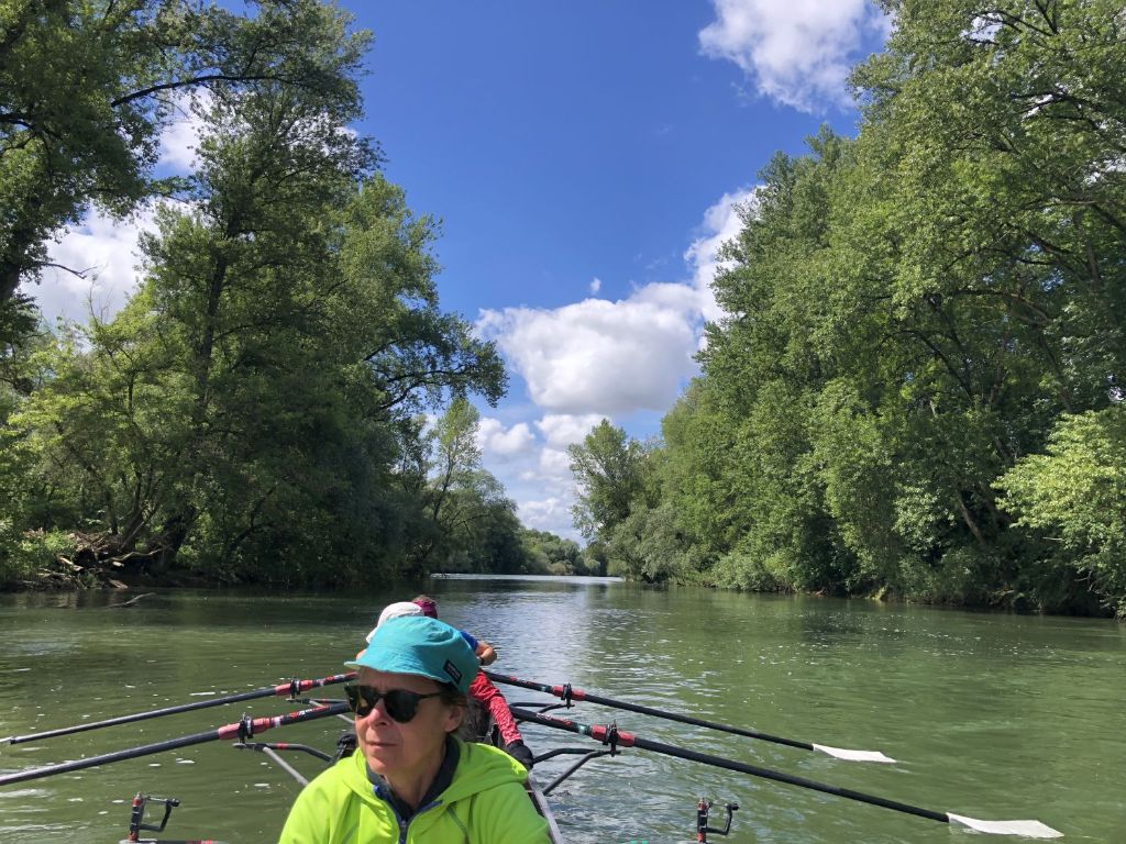 Bald verlassen wir den Doubs und rudern vermehrt auf dem parallel verlaufenden Canal du Rhône au Rhin – nur erfahrene Steuerfrauen wie Svanja schaffen das schlangenlinienfrei und dann mit Schwung und eingezogenen Skulls unter den engen Brückenfeilern hindurch. Andere müssen da noch üben! Ein Zwischenstopp, auf dem die weidenden Kühe genauso respektvoll Abstand halten wie wir.