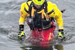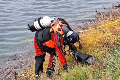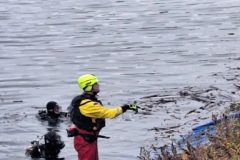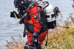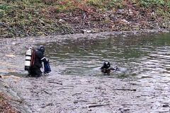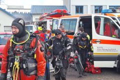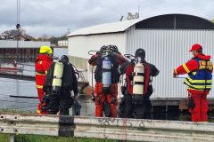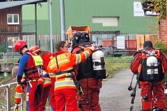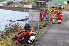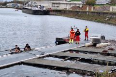Das letzte Wort ist durchaus ernst zu nehmen, denn mit einer Stunde Verspätung tauchten die Wasserretter erst ab und dann wieder auf. Gesichert an langen gelben Leinen und mit viel Personal am Rand des Nordbeckens vor unserem Bootshaus. Sogar Funkverbindung besteht ins trübe Nass des Hafenwassers.