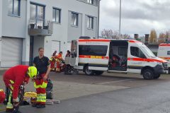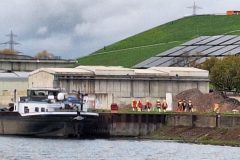 Geübt werden sollte die Rettung Verletzter an der stählernen Kaimauer. Allerdings versteckt hinter dem Bug des da festgemachten Frachters und ohne Nutzung der Treppen! Deshalb beteiligten sich auch Höhenretter in voller Montur. Aber nicht von der Bergwacht sondern im selben gelb-roten Dress wie alle anderen Beteiligten.