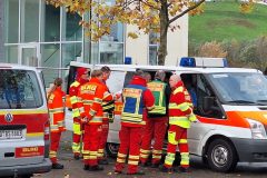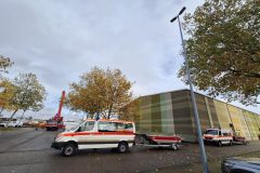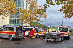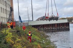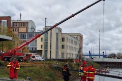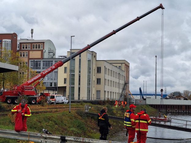 Nur die beiden Kranwagenfahrer der Feuerwehr fielen aus der Kleiderordnung heraus. Sie mussten aber ganz einsam über eine halbe Stunde ausharren, bis überhaupt mal ein Rettungsfahrzeug der schwimmenden Truppe ankam. Immerhin mit Blaulicht. Dann dauerte es allerdings nochmal eine halbe Stunde, bis das erste Boot auf dem Parkplatz des Hafenkontors auf der anderen Seite des Nordbeckens am Haken schwebte.