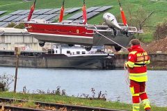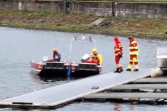 Beachtlich ist schon, mit was so ein kleines Boot erstmal alles aufgerüstet werden muss, bevor es schweben und dann zu Wasser gelassen werden kann. Das alles war auch Teil der Übung der ehrenamtlichen Helfer, die aus Baden zusammenkamen. Von Heidelberg bis Freudenstadt. In Not wollte ich im Nordbecken angesichts der langen Prozedur aber nicht gewesen sein. Gut dass es an der Einfahrt zum Nordbecken für den Fall des Ernstfalls eine Bootsrampe gibt.