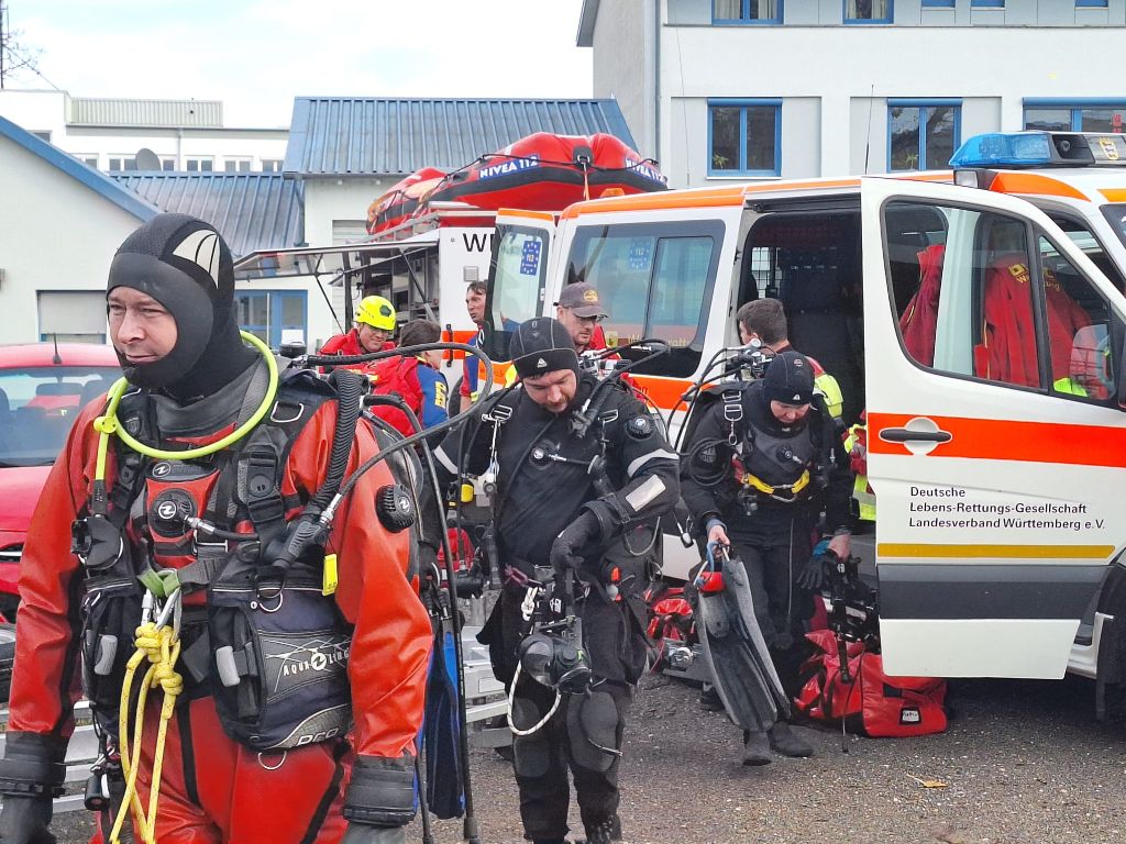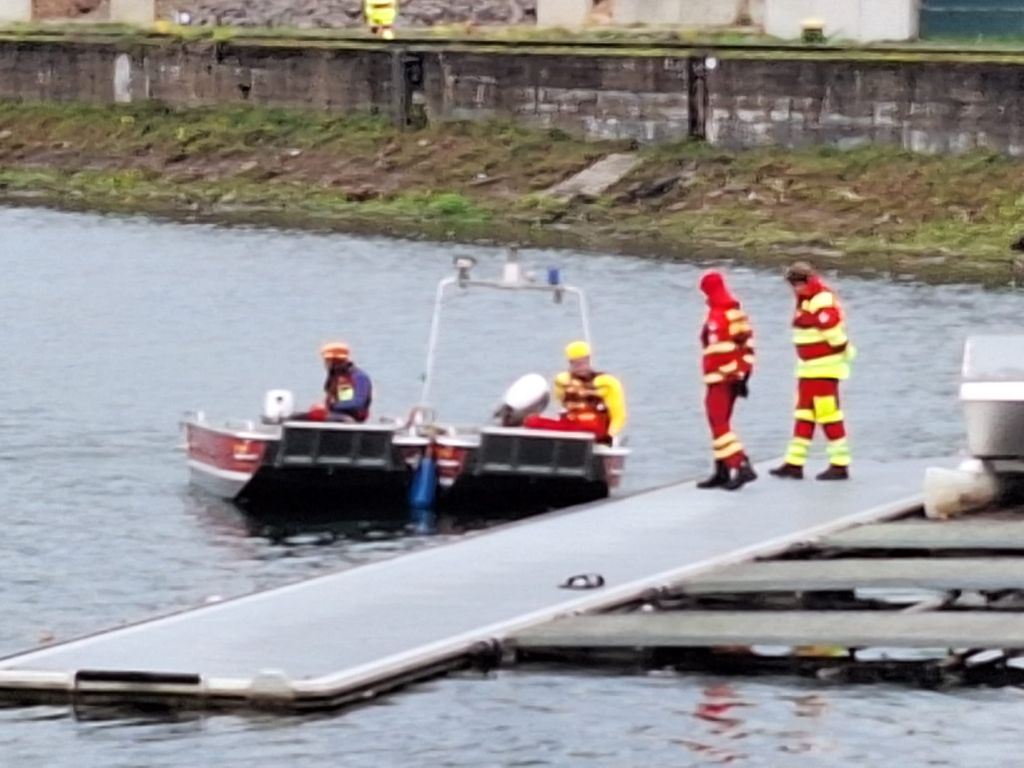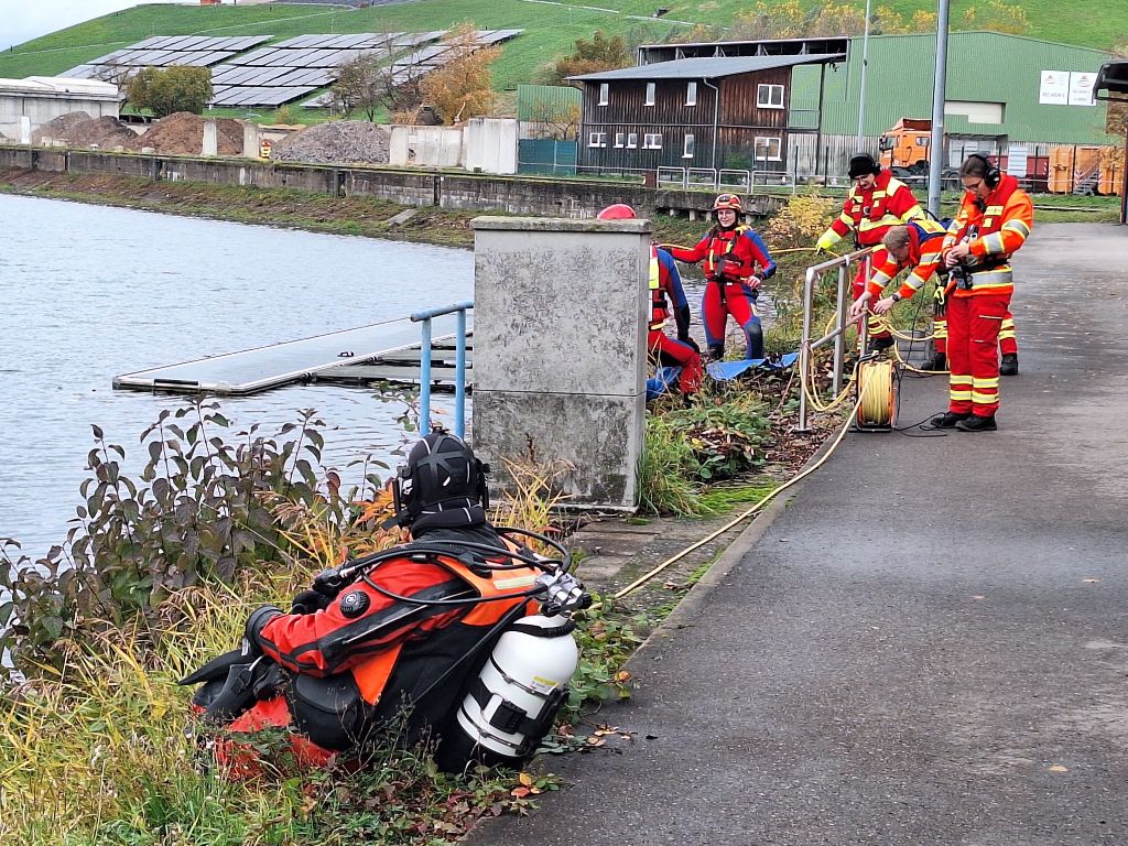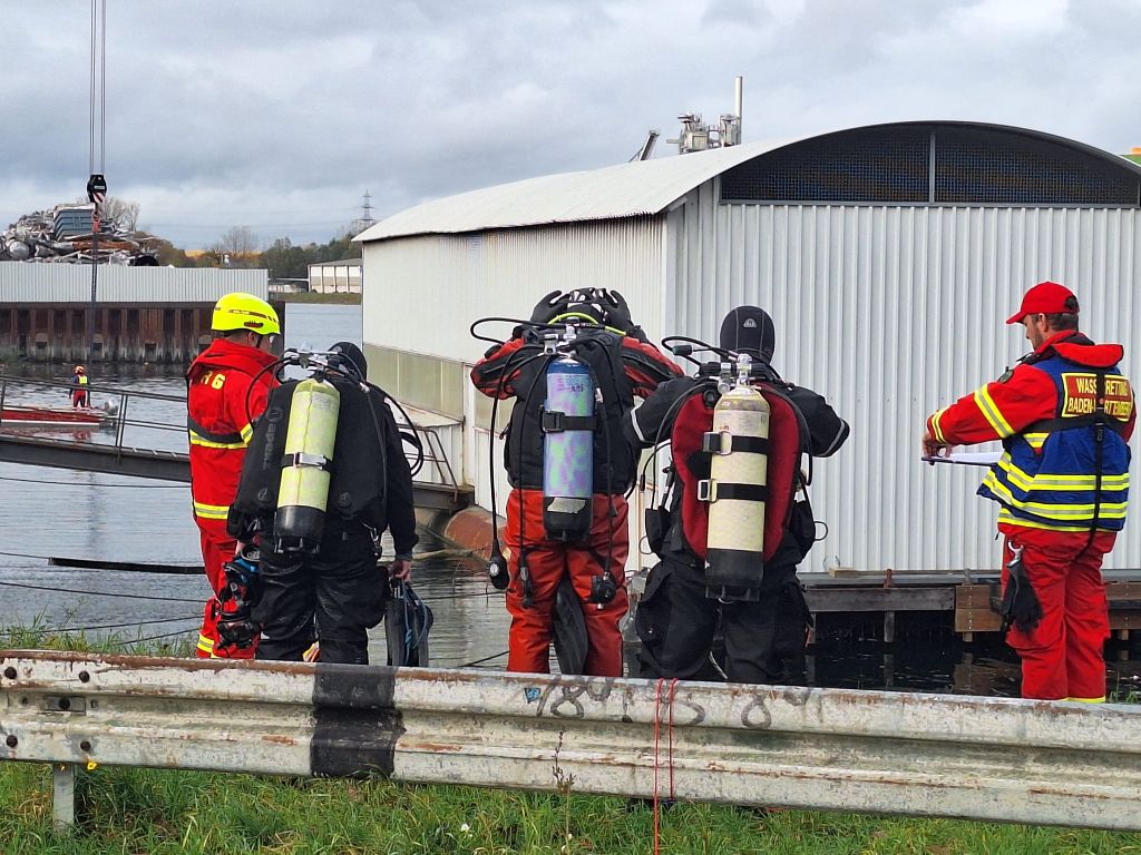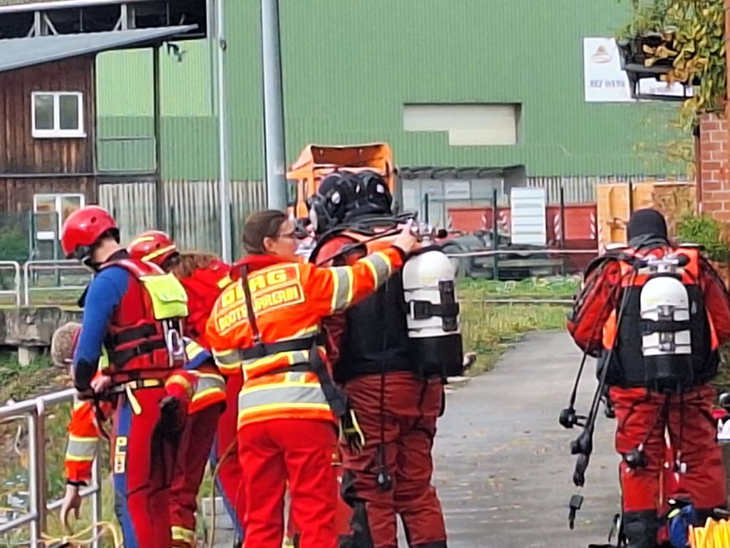 Das letzte Wort ist durchaus ernst zu nehmen, denn mit einer Stunde Verspätung tauchten die Wasserretter erst ab und dann wieder auf. Gesichert an langen gelben Leinen und mit viel Personal am Rand des Nordbeckens vor unserem Bootshaus. Sogar Funkverbindung besteht ins trübe Nass des Hafenwassers.
