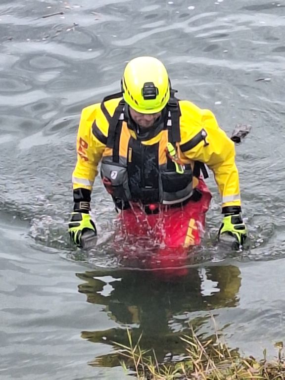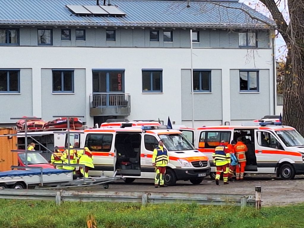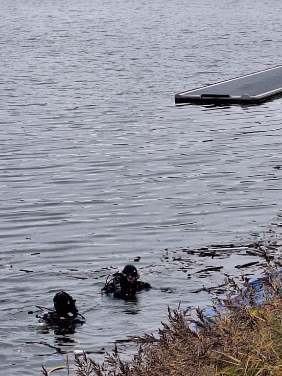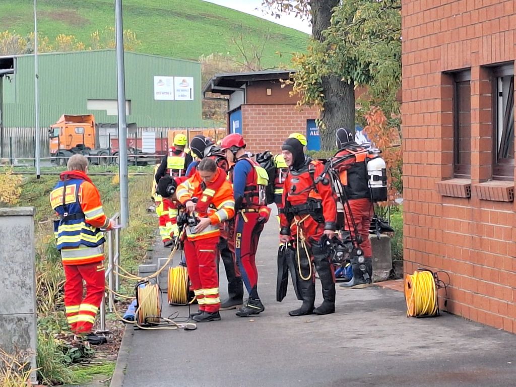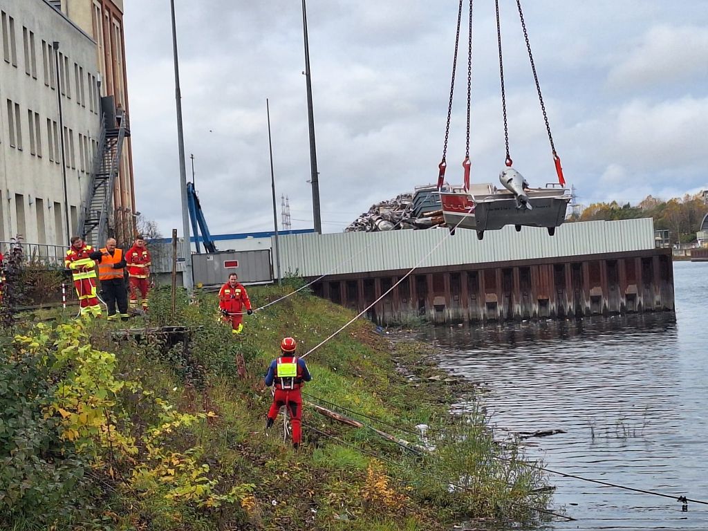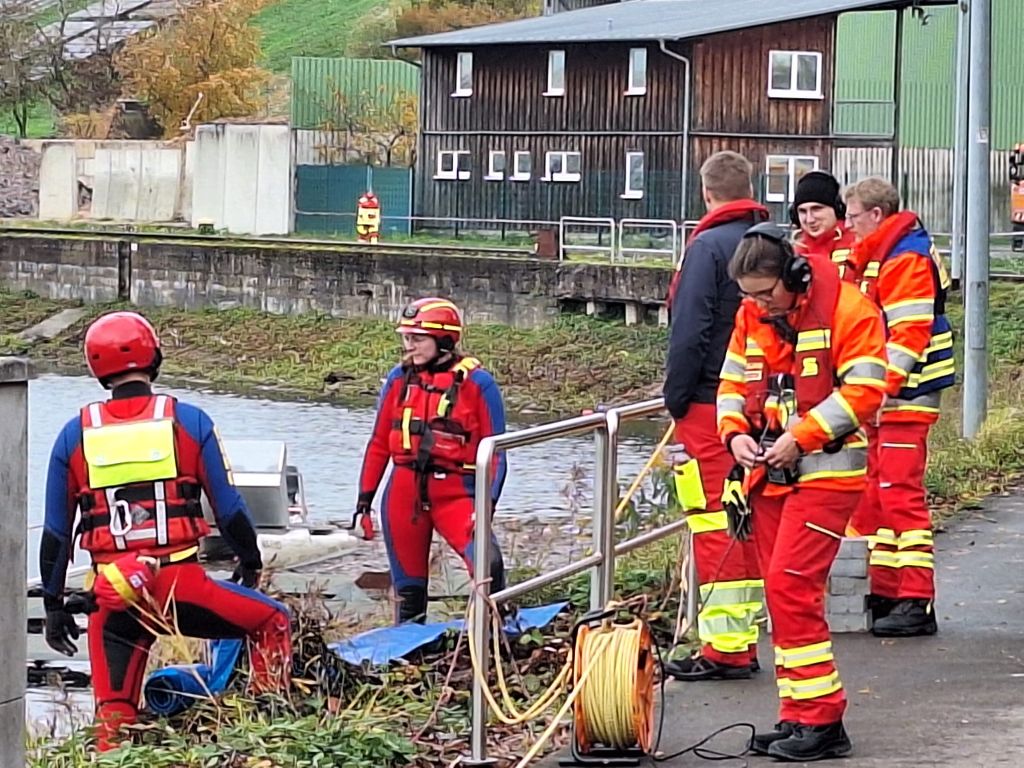 Das letzte Wort ist durchaus ernst zu nehmen, denn mit einer Stunde Verspätung tauchten die Wasserretter erst ab und dann wieder auf. Gesichert an langen gelben Leinen und mit viel Personal am Rand des Nordbeckens vor unserem Bootshaus. Sogar Funkverbindung besteht ins trübe Nass des Hafenwassers.