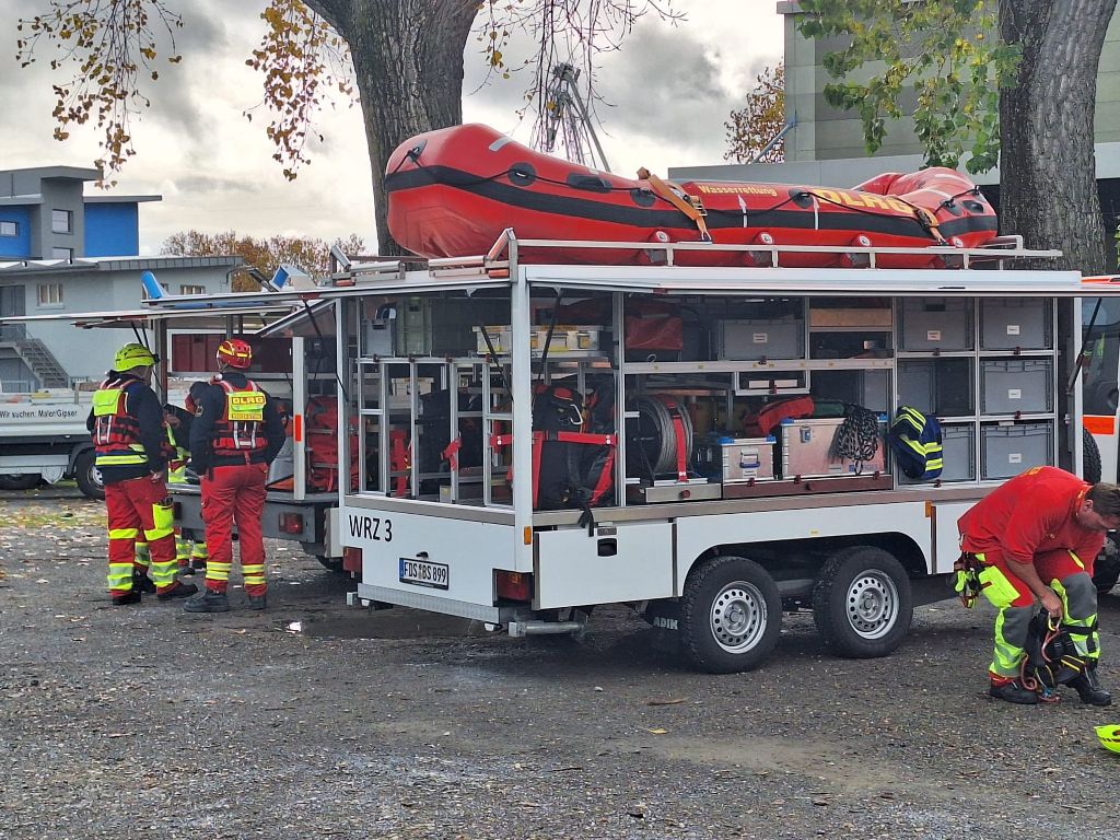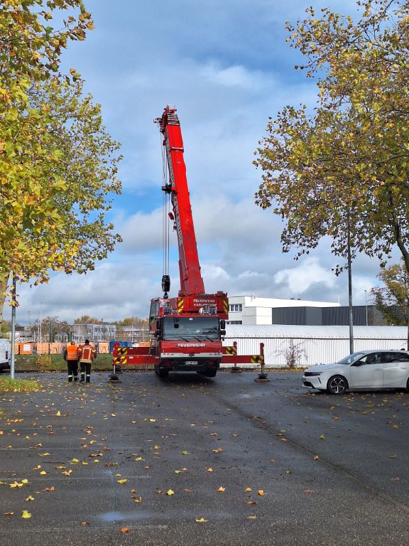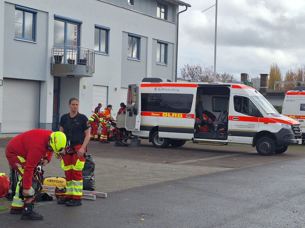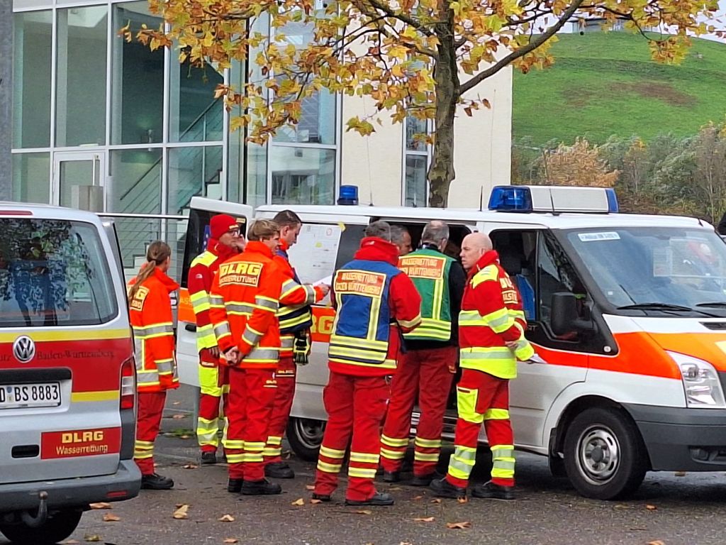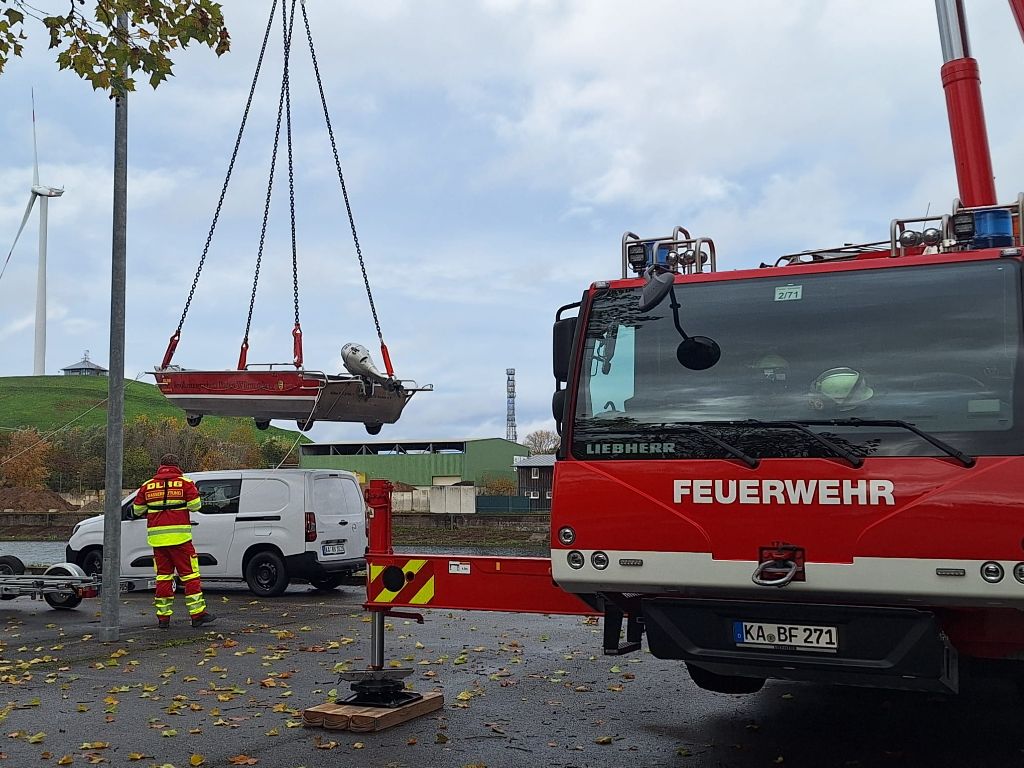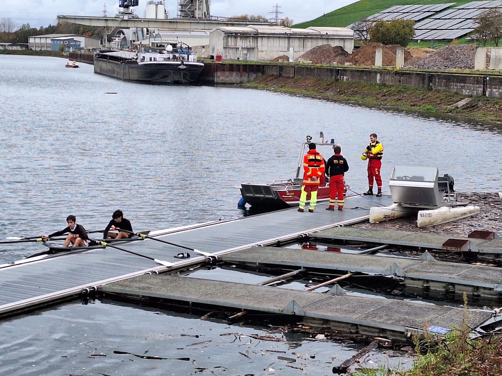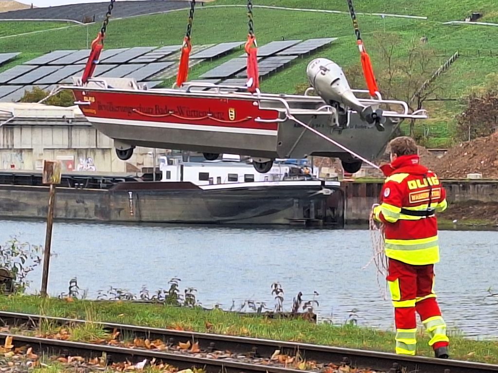 Beachtlich ist schon, mit was so ein kleines Boot erstmal alles aufgerüstet werden muss, bevor es schweben und dann zu Wasser gelassen werden kann. Das alles war auch Teil der Übung der ehrenamtlichen Helfer, die aus Baden zusammenkamen. Von Heidelberg bis Freudenstadt. In Not wollte ich im Nordbecken angesichts der langen Prozedur aber nicht gewesen sein. Gut dass es an der Einfahrt zum Nordbecken für den Fall des Ernstfalls eine Bootsrampe gibt.