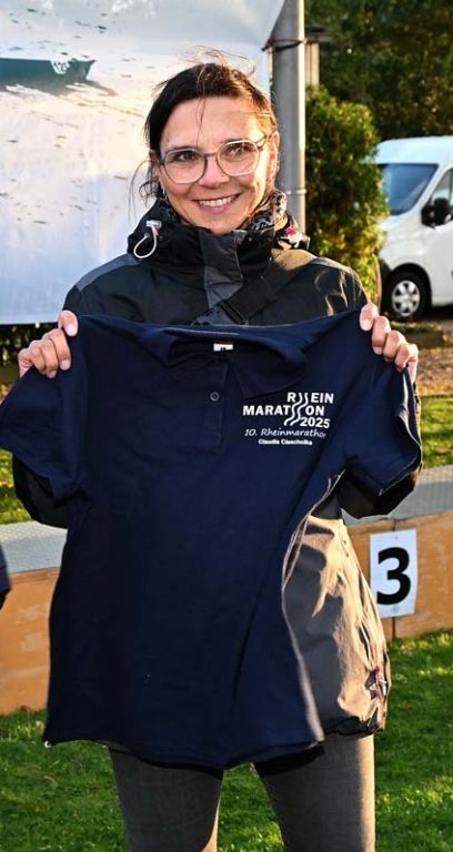Zum Abschluss der Ehrungen wurde Claudia dann das niegelnagelneue individualisierte Wiederholungstäter-Poloshirt für die zehnte Zielankunft überreicht: