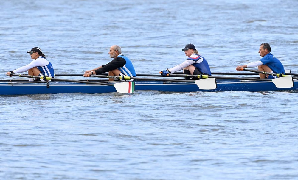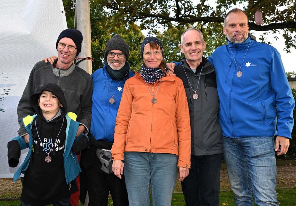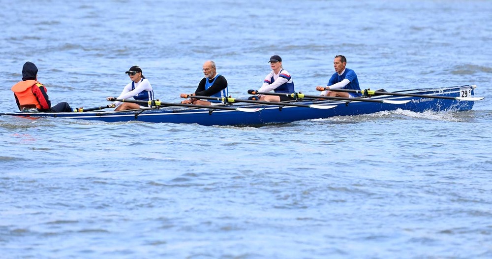 Der Junge-Mixed-Vierer mit Mariarita, Ariane, Johannes, Frederic und Anke an den Steuerseilen hatte sich wie schon ’24 bei der Auswahl des Rennens taktisch vergriffen: mal ist die Konkurrenz in der Altersklasse 36 Jahre schneller als die offene Klasse, mal umgekehrt. Nun wurde es Platz 4 – gerade nicht auf dem Treppchen und leider auch ohne Foto.