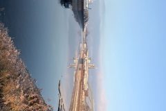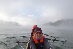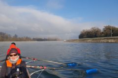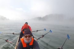 Der Steg liegt unberührt vor uns, raureifbedeckt, die Boote 1901 und Rheinaue werden für je 3 Ruderleute plus Steuermensch präpariert. Die Sonne erhebt sich am blauen Himmel, über dem Hafenwasser ziehen leichte Dunstschleier, welch morgendliche Schönheit. Schon vor der Rheimole ist uns warm, dann geht es hinaus auf den Rhein. Die Sonne blendet, heute müssen wir aber keine Sportboote fürchten, deren Wellen uns Wasser ins Boot spülen. Es geht sich gemütlich an, die Kälte bleibt noch außen vor, nur die Steuerfrau rechnet sich den Wechsel bei Rheinkilometer 371 schon einmal aus. Aber soweit soll es gar nicht kommen: Vor uns – zunächst nur sichtbar vom Steuersitz – zieht sich der Nebel immer mehr zu, plötzlich sind auch die Ufer kaum noch zu sehen, die Hektometer verschwinden. Steuerfrau und Obmann beraten sich kurz, die Entscheidung fällt umgehend: wir kehren um, das wird zu gefährlich. Die Sicht ist auf vielleicht 50 m begrenzt, die nächste Boje oder auch ein Schiff nicht auszumachen, Rufe erreichen uns, wir können diese aber nicht lokalisieren oder verstehen (- im Bootshaus stellt sich heraus, dass es vom anderen Boot kam).