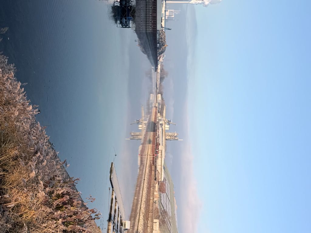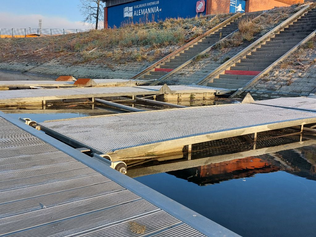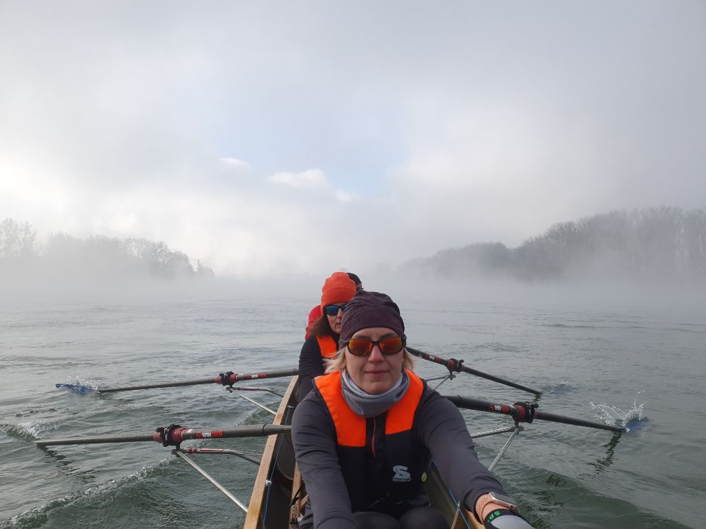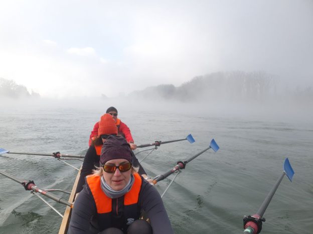 Der Steg liegt unberührt vor uns, raureifbedeckt, die Boote 1901 und Rheinaue werden für je 3 Ruderleute plus Steuermensch präpariert. Die Sonne erhebt sich am blauen Himmel, über dem Hafenwasser ziehen leichte Dunstschleier, welch morgendliche Schönheit. Schon vor der Rheimole ist uns warm, dann geht es hinaus auf den Rhein. Die Sonne blendet, heute müssen wir aber keine Sportboote fürchten, deren Wellen uns Wasser ins Boot spülen. Es geht sich gemütlich an, die Kälte bleibt noch außen vor, nur die Steuerfrau rechnet sich den Wechsel bei Rheinkilometer 371 schon einmal aus. Aber soweit soll es gar nicht kommen: Vor uns – zunächst nur sichtbar vom Steuersitz – zieht sich der Nebel immer mehr zu, plötzlich sind auch die Ufer kaum noch zu sehen, die Hektometer verschwinden. Steuerfrau und Obmann beraten sich kurz, die Entscheidung fällt umgehend: wir kehren um, das wird zu gefährlich. Die Sicht ist auf vielleicht 50 m begrenzt, die nächste Boje oder auch ein Schiff nicht auszumachen, Rufe erreichen uns, wir können diese aber nicht lokalisieren oder verstehen (- im Bootshaus stellt sich heraus, dass es vom anderen Boot kam).