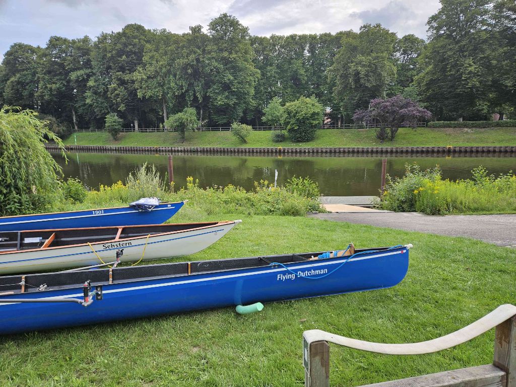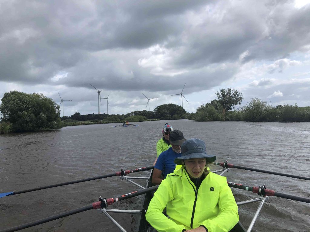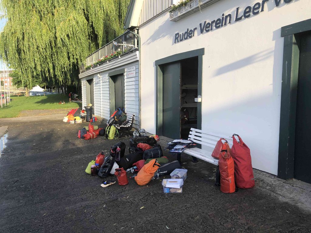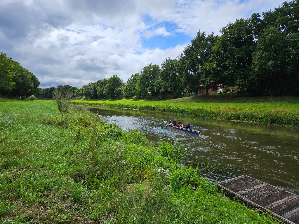 Nach einer Übernachtung im Ruderverein in Hann. Münden erreichten wir den Startpunkt Herzlake an der Hase im tiefsten Emsland. Von dort aus rückte am Samstag eine 3er Mannschaft mit Fahrzeugen und Bootsanhänger aus an den Zielort Nordenham, um die Fahrzeuge dort für unsere Rückreise bereitzustellen. Der Rest der Teilnehmer*innen verbrachte zum Aufwärmen der Gruppendynamik einen unvergesslichen Tag in Herzlake, wo man sich an Garagenflohmärkten, diversen Regenschauern, ausgedehnten Aufenthalten im Cafe, sowie nahezu unzähligen Besuchen im Edeka erfreuen konnte. Die Ausgereisten kehrten pünktlich zum Abendessen nach Bahn-/Bus- und Taxifahrt von ihrer Rundtour zurück – wir waren ruderbereit!