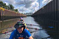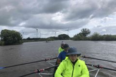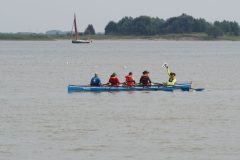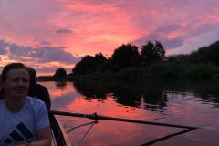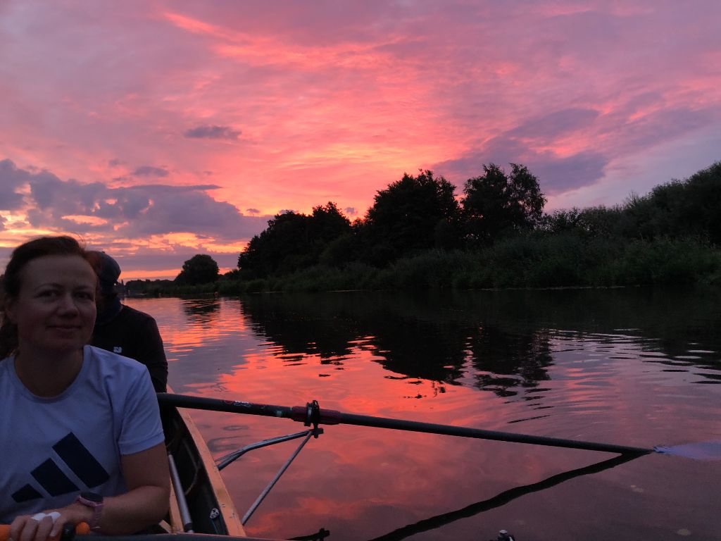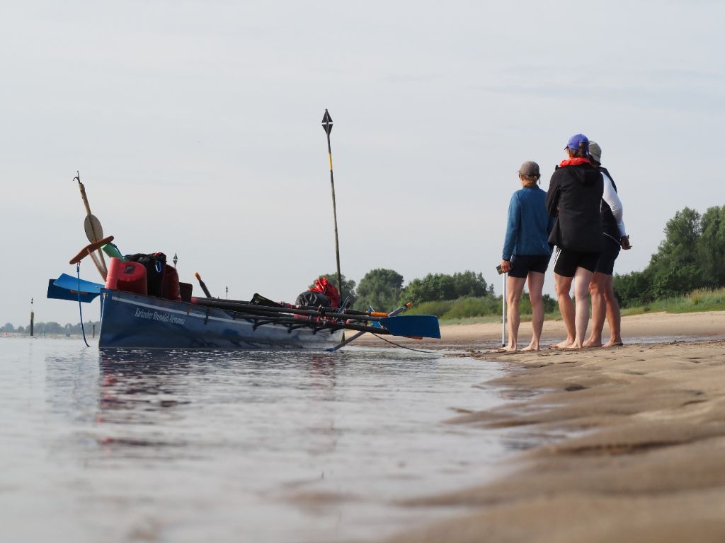 Uhrzeittechnische Ausnahmen gab es natürlich, vor allem das Wiedersehen mit dem Roll-/Steuersitz um 5.30 Uhr bei romantischem Sonnenaufgang in Oldenburg war etwas Besonderes. Aber da war man ja schon 5 Tage unterwegs gewesen und somit an alles gewöhnt. Wir erreichten die morgendliche Schleuse natürlich rechtzeitig und auch die weiteren schleusen- und tideabhängigen Start- und Pausenzeiten sind gelungen. So kann man um 4 Uhr aufstehen, um 3 Stunden zu rudern und dann 6 Stunden am Strand an der Weser zu verbringen, um dann nochmal 2-3 Stunden zu rudern, um rechtzeitig vor 18 Uhr in Nordenham zu sein, bevor der Steg des Rudervereins trockenfällt und für uns unerreichbar würde.