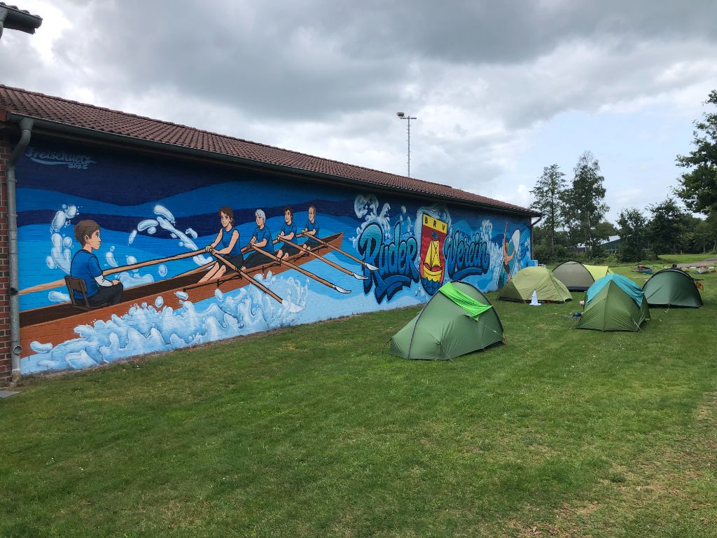 Besonders zugute kam uns der Campingplatz mit einladender Zeltwiese in Nachbarschaft zum Nordenhamer Ruderverein, auf dem wir von Freitag bis Montag nächtigten.