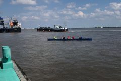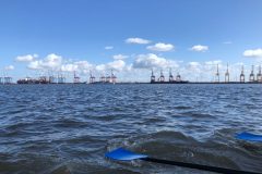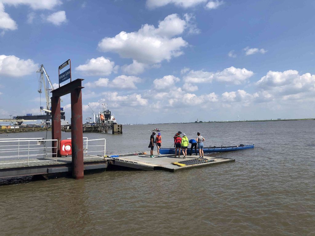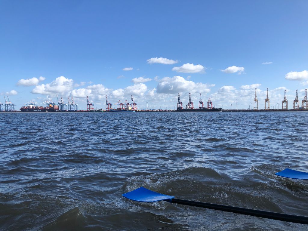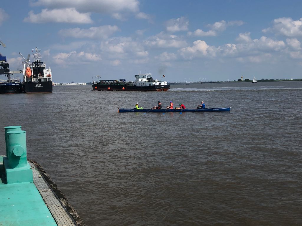Unsere Wanderfahrt führte uns bis an unseren Zielort Nordenham an der Weser. Die letzten Kilometer bis dorthin waren recht abenteuerlich bis nervenaufreibend aufgrund des unruhigen Wassers mit ordentlichen Wellen! Man dachte zwar, wir sind ja rheinerprobt, aber die Dimensionen der Frachtschiffe und die Größe der Weser in Kombination mit der Lage des Rudervereins ließen einen doch erstmal staunen.