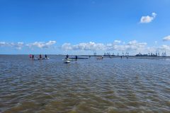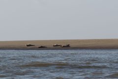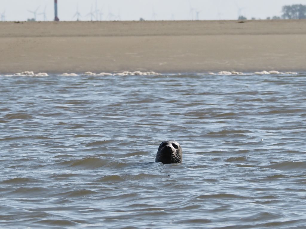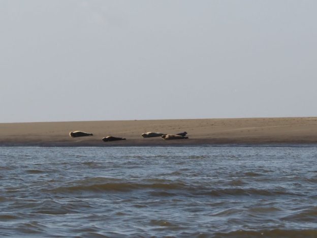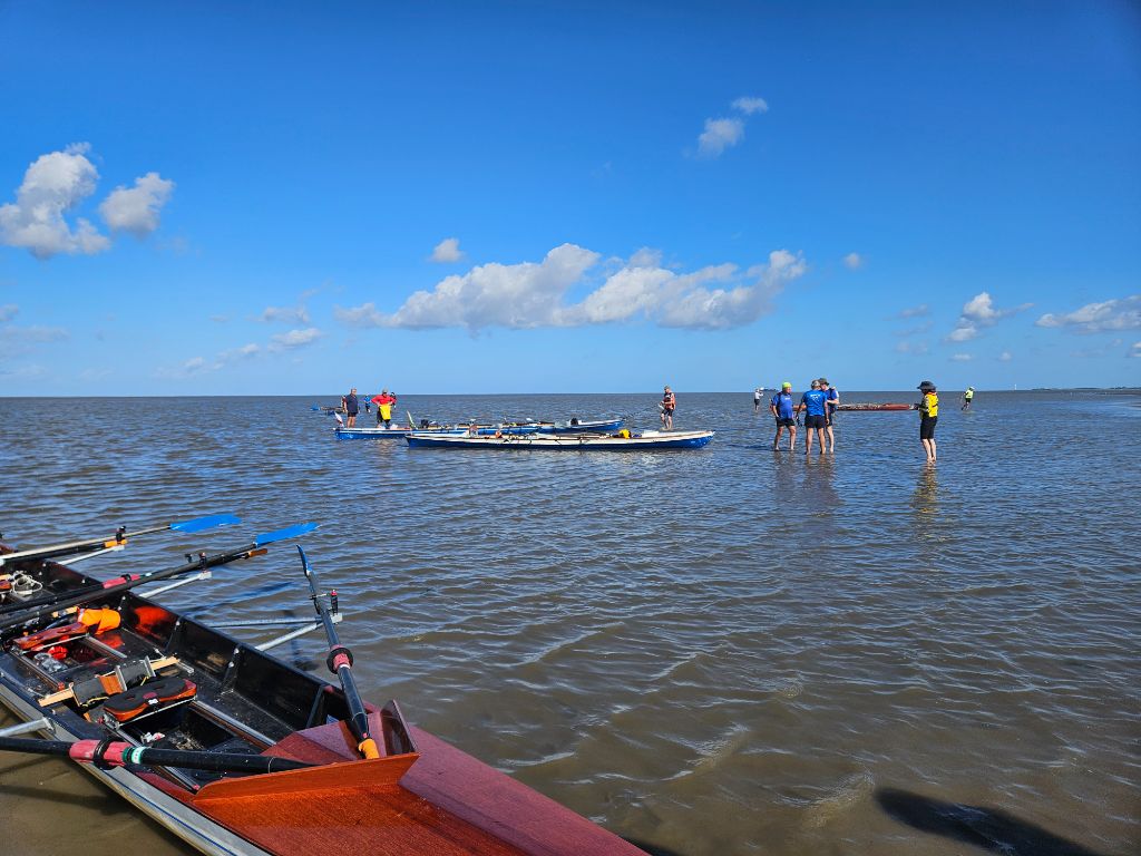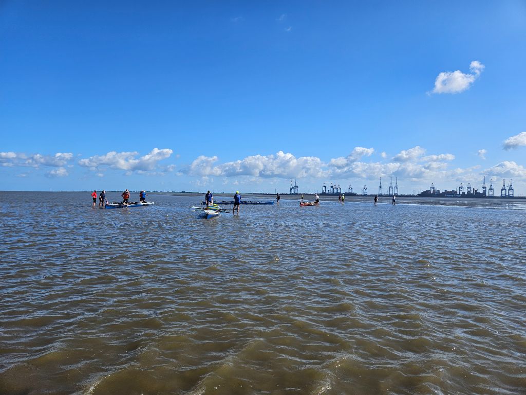 Am Sonntag, dem letzten Tag unserer Reise, wollte sich niemand das Highlight der Wattfahrt entgehen lassen. Um 7 Uhr morgens war der Treffpunkt am Ruderverein, damit die 8 Boote inkl. weiteren Gästen in Nordenham gemäß Zeitplan mit ablaufendem Wasser aufbrechen konnten. Wir folgten aufgeregt den Einheimischen an Bremerhaven vorbei raus aufs offene Wasser der Unterweser bis zum Suezpriel, dann entdeckten wir sie… unzählige Robben! Sie fühlten sich wohl irgendwann etwas bedrängt und flüchteten von ihrer Sandbank ins Wasser, wo nur noch ihre runden Köpfe mit großen Augen auszumachen waren. Ein Stück weiter nahmen wir dann für ca. eine Stunde die Sandbank ein, wir liefen „auf Grund“ und konnten aussteigen, bis die Flut sehr zügig die Sandbank wieder völlig verschwinden ließ und wir uns mit der Strömung auf den Rückweg machten. Das war wirklich ein abenteuerliches Erlebnis, das man so nicht alle Tage erleben kann!