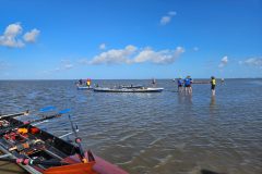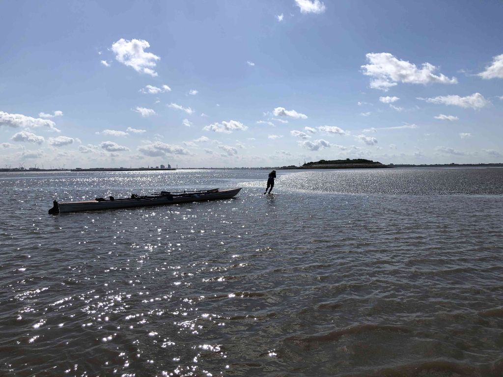 Die Strandpause in Oberhammelwarden (ja, es heißt wirklich so) war alles andere als lange Wartezeit. Zuerst war es schon spannend gewesen, mit ablaufendem Wasser zu rudern, bis man sich irgendwann besser ins Zeug legte, um noch einigermaßen voranzukommen. Am Pausenziel gab es Erholungsprogramm: z.B. Eiskaffee im „Strandcafe“ – illegalerweise schuhlos bzw. mit einem (einzigen) Wechselpaar – und natürlich der Besuch von Julias Eltern, die uns mit einem ganzen Picknick mit Butterkuchen, Frikadellen, Baguette, Käse, Trauben und Kaffee versorgten! Großartig, und vielen Dank nochmal! Das Picknick und die Boote retteten wir dabei mehrfach vor dem auflaufenden Wasser auf die nächsthöhere Düne, das Wasser kam unerwartet schnell und stieg ebenso unerwartet hoch!