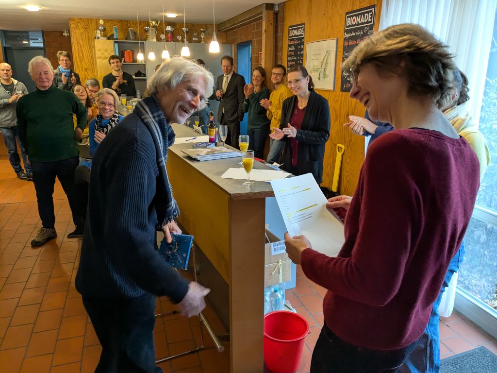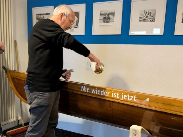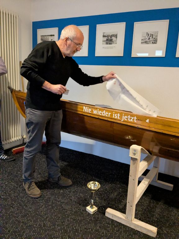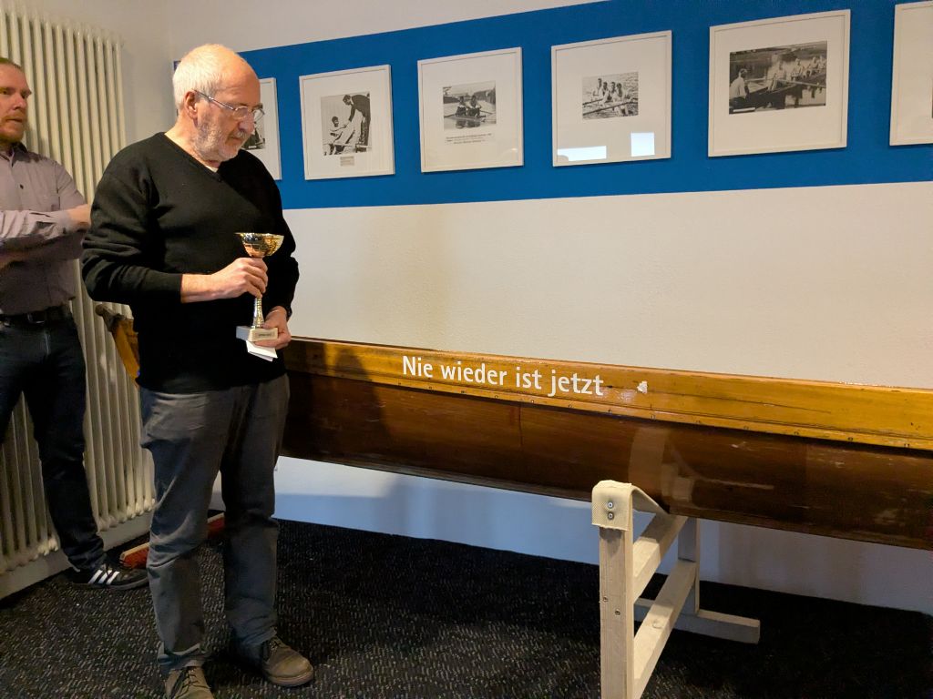 Nachdem diese Erkenntnisse nun vorliegen, hat der aktuelle Vorstand in Zusammenarbeit mit dem Ältestenrat eine bewusste Entscheidung getroffen: Eines der ältesten Boote des Vereins, das bis heute in der Anfängerausbildung genutzt wird, wurde umgetauft. Eine Umbenennung ist im Rudersport eher unüblich – in diesem Fall jedoch ein bewusstes und deutliches Zeichen. Andreas Roth erläuterte beim Neujahrsempfang die historischen Hintergründe und taufte das Boot auf seinen neuen Namen: